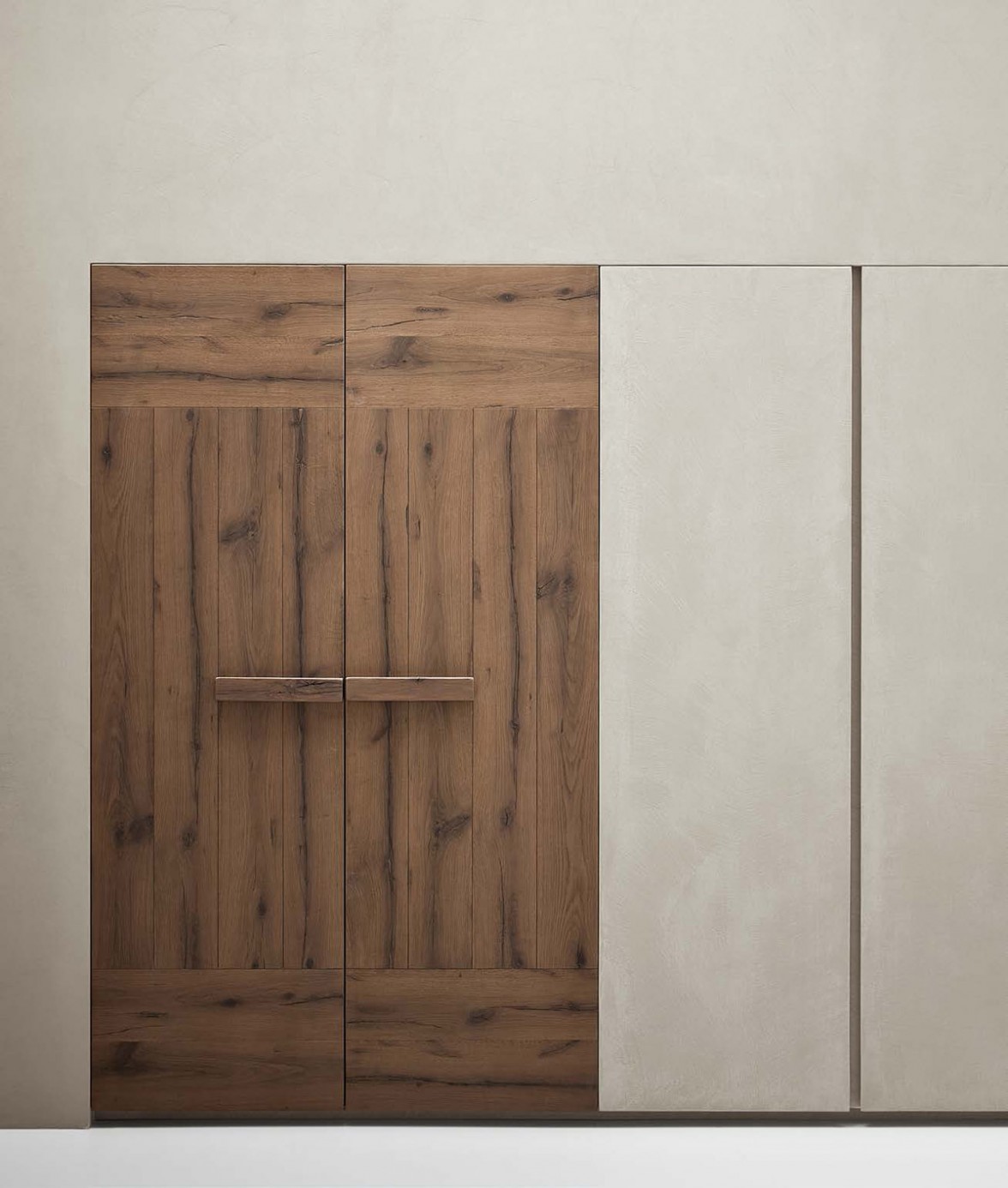 Finitura frontale pensili, anta colonna e piano snack rovere tavolato.