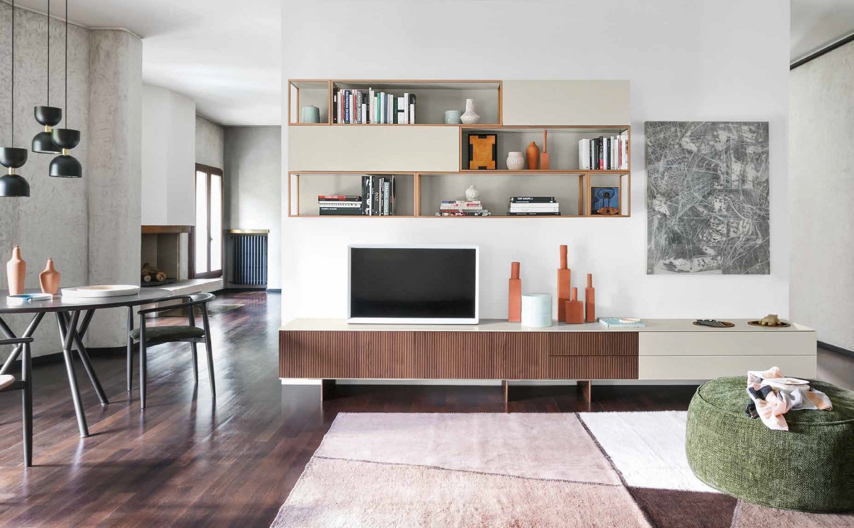 Composizione giorno caratterizzata dai frontali RAIS finitura noce canaletto e dai contenitori giorno con telaio in metallo finitura metal rame